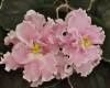 Очень крупные (6см) полумахровые и махровые нежно-яблоневые округлые звёзды с сиренево-пурпурным фэнтези и таким же к...