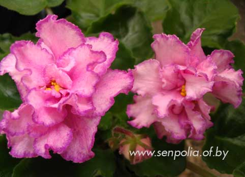 Крупные махровые нежно-розовые цветы с размытым белым центром и белой кружевной каймой. Пестролистник