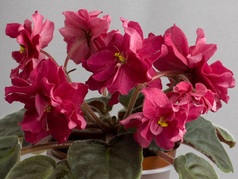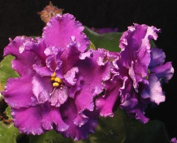 Огромные (7см) махровые пушистые волнисто-гофрированные ежевично-пурпурные звезды над зеленой розеткой. Очень красива...